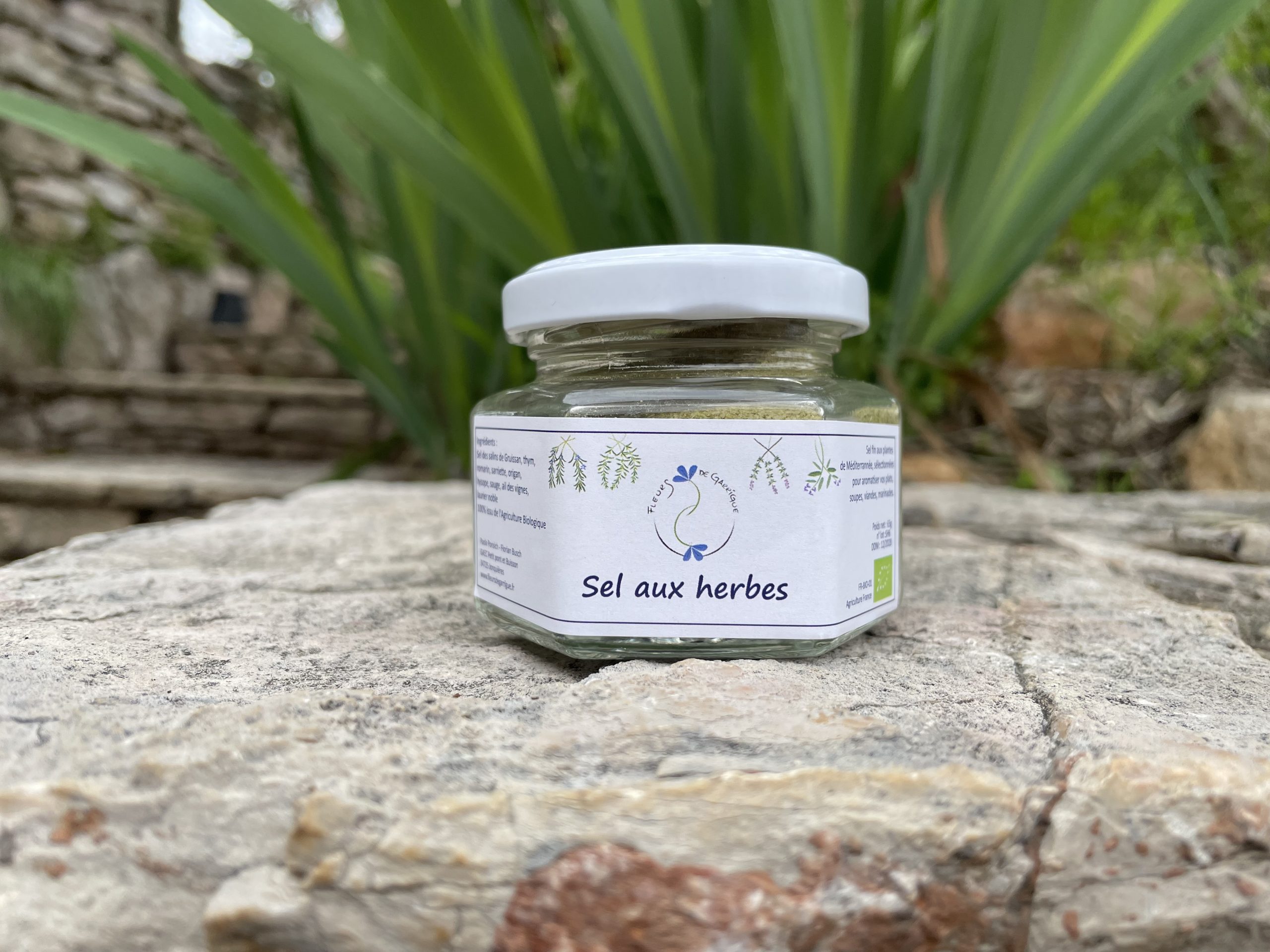 Fine poudre de sel aux herbes aromatiques à base de thym, romarin, sarriette, origan, hysope, bourrache, fleurs d’ail sauvage, fleurs de laurier noble,